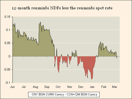 人民币远期市场正再次发出悲观信号。自1月中旬以来,人民币无本金交割远期(NDF)价格第一次反映出市场对未来12个月人民币兑美元汇率涨幅为零的预期。