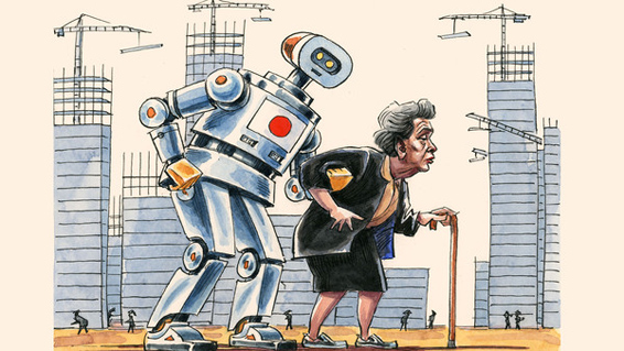 我的一个想法是,或许应当启动一个“日本老奶奶观察”项目,因为日本在预期寿命延长以及人口生育率下降方面的教训令人警醒。这两大趋势在日本都表现得格外显著,不过,在绝大多数富裕国家也都或多或少地存在。日本人口总量自2010年以来开始下降。预计到了2060年,日本人口将从目前的1.27亿降至8670万,届时将有约40%的日本人年龄在65岁以上。受此影响,“护理机器人”将成为了一个日益繁荣的行业的核心产品。这种机器人能够帮助老奶奶完成如厕之类的任务,还能与人进行关于天气的简单对话。