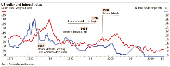 从历史上看,美国上调利率通常会导致或者促使新兴市场崩盘,例如二十世纪八十年代拉丁美洲国家政府的破产潮、1994年墨西哥的“龙舌兰酒危机”以及二十世纪九十年代末期的亚洲金融危机。