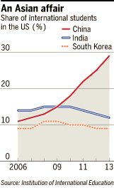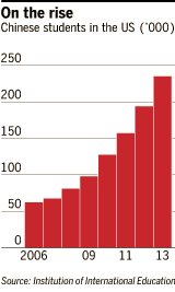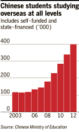 过去10年中,中国留学生的人数已增长逾两倍,而且还在继续增长。来自中产阶级下层家庭的留学生人数增长尤为迅猛:根据中国社科院(Chinese Academy of Social Sciences)的一份报告,2009年底,来自中产阶级下层家庭的留学生人数仅占留学生总人数的2%,但到2010年底,这个比例升到了34%。