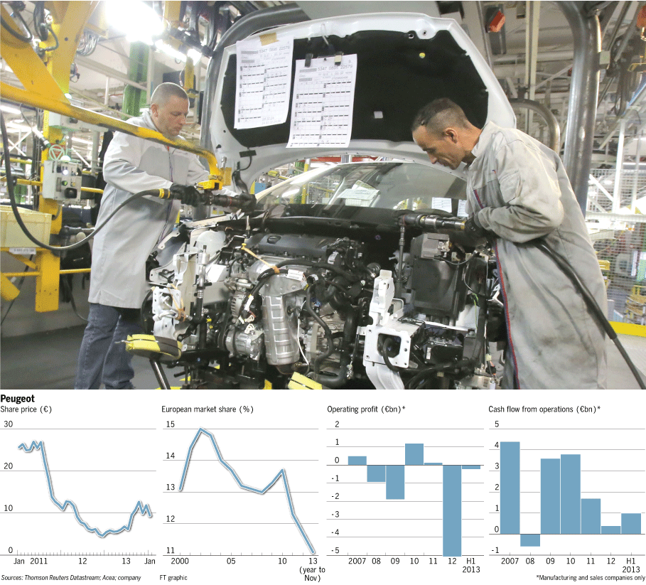 在2013年的乱局之前,标致已经连续五年身陷困境。该公司过于依赖不断萎缩的欧洲汽车市场,同时在欧洲地区的市场份额从2007年的19%降至约13%。标致在巴西和俄罗斯也经营艰难。该公司的现金大量流失,市净率为整个全球汽车行业中最糟糕的。