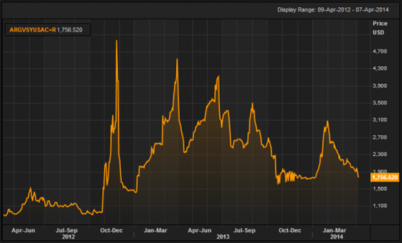 对投资者来说,乌克兰危机至少已明朗化,而委内瑞拉和阿根廷的投资者仍处于不确定的状态,他们不清楚接下来会发生什么。可以看看这两个国家5年期信用违约互换(CDS)的利差(5年期CDS是一种用来防范今后5年内出现债务违约的保险工具)。下面第一张图是关于委内瑞拉的情况,第二张是阿根廷的。